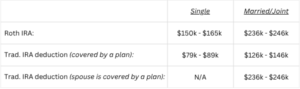 In 2025, for example, eligibility for Roth or deductible IRA contributions begins to phase out at the following Modified Adjusted Gross Income (MAGI) levels: